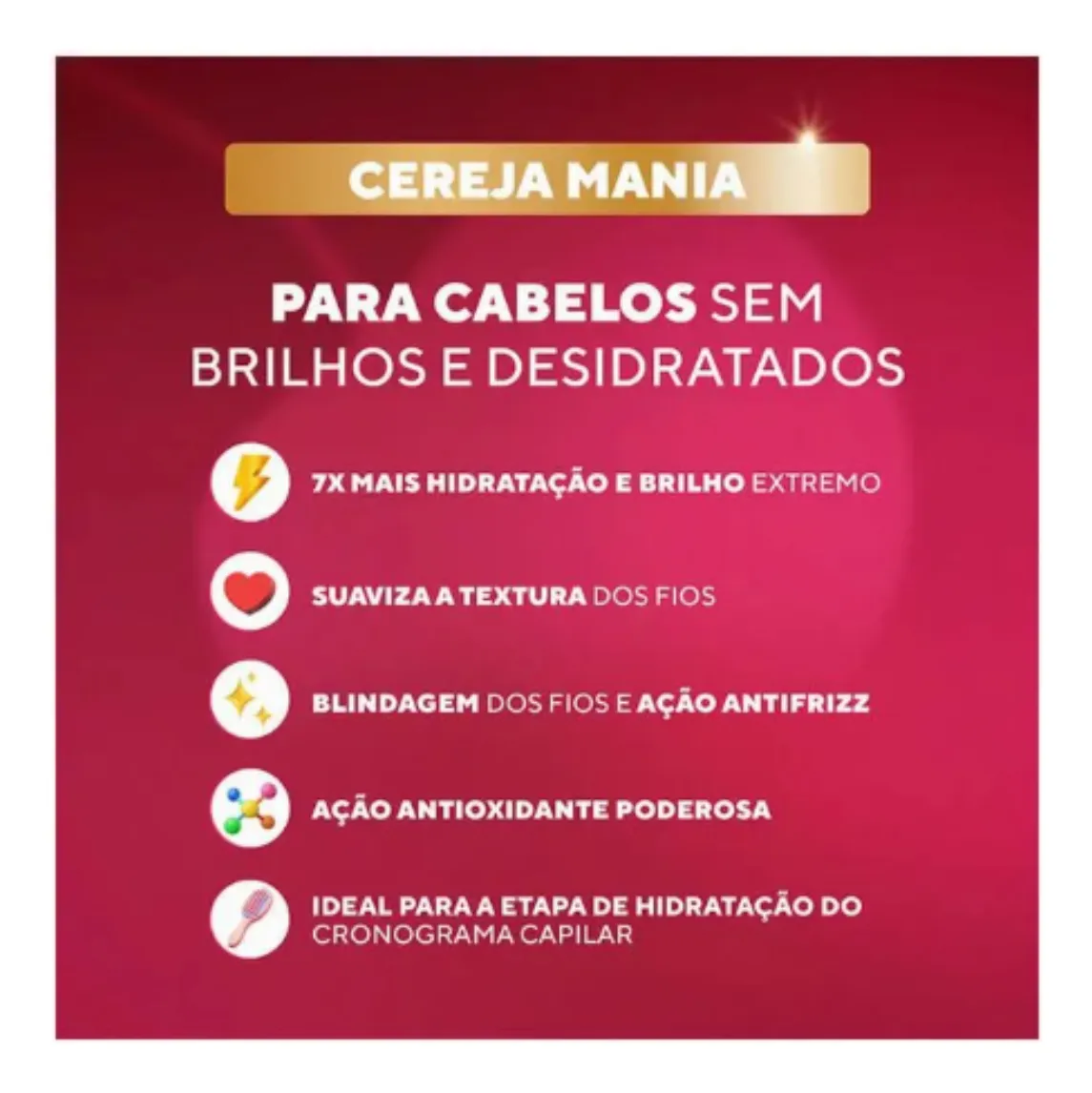 – Hidratação profunda e duradoura: A cereja, cheia de nutrientes, repõe a água dos fios, promovendo hidratação intensa e brilho que encanta.