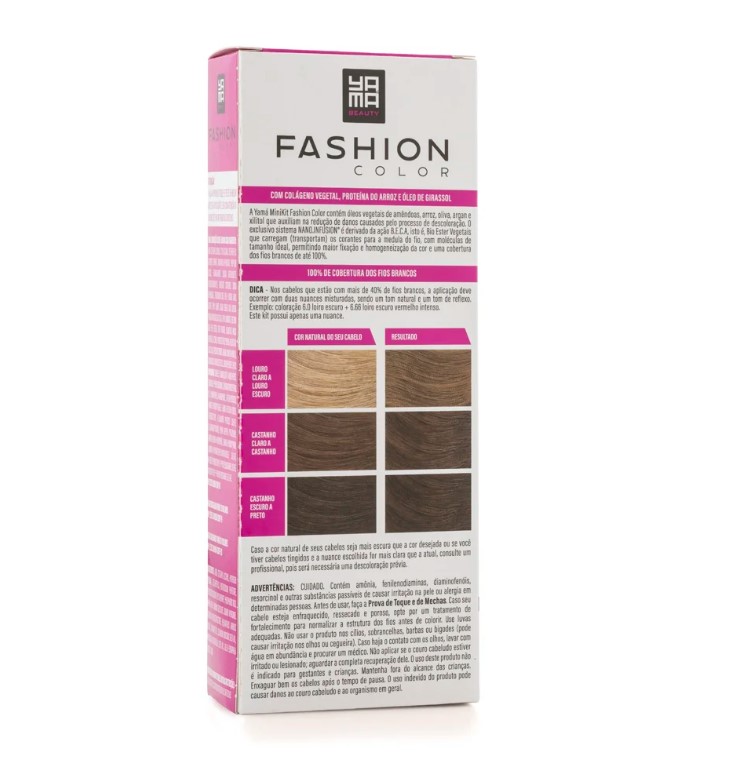 A Yamá MiniKit Fashion Color contém óleos vegetais de amêndoas, arroz, oliva, argan e xilitol que auxiliam na redução de danos causados pelo processo de descoloração. O exclusivo sistema NANO.INFUSION® é derivado da ação B.E.C.A, isto é, Bio Ester Vegetais que carregam (transportam) os corantes para a medula do fio, com moléculas de tamanho ideal, permitindo maior fixação e homogeneização da cor e uma cobertura dos fios brancos de até 100%.